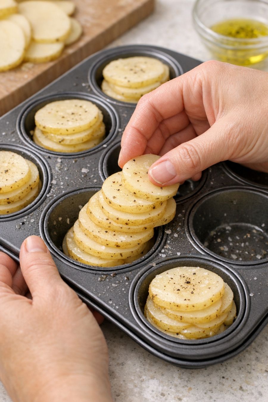 Ismételd a rétegezést – krumpliszeletek, majd sajt –, amíg a muffinformák majdnem a tetejéig meg nem telnek. Közben óvatosan nyomd le a halmokat az ujjaiddal, hogy szépen és tömören maradjanak.